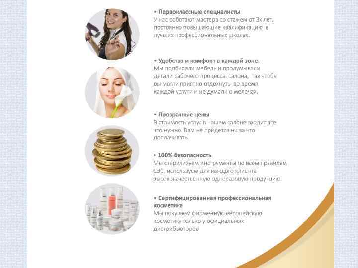 Ермолаева Юлия www. salonexpert. ru Описание услуги: Продающее: Описание результата для клиента. Пример: «Мгновенный лифтинг» Заметное повышение тонуса кожи, здоровый цвет и сокращение видимости морщин за 1 час. Идеально подходит как экспресспроцедура "На выход" для праздника, свидания, отдыха или важной встречи.