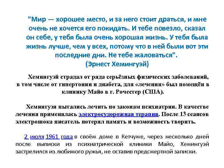 "Мир — хорошее место, и за него стоит драться, и мне очень не хочется его покидать. И тебе повезло, сказал он себе, у тебя была очень хорошая жизнь. У тебя была жизнь лучше, чем у всех, потому что в ней были вот эти последние дни. Не тебе жаловаться". (Эрнест Хемингуэй) Хемингуэй страдал от ряда серьёзных физических заболеваний, в том числе от гипертонии и диабета, для «лечения» был помещён в клинику Майо в г. Рочестер (США). Хемингуэя пытались лечить по законам психиатрии. В качестве лечения применялась электросудорожная терапия. После 13 сеансов электрошока писатель потерял память и возможность творить. 2 июля 1961 года в своём доме в Кетчуме, через несколько дней после выписки из психиатрической клиники Майо, Хемингуэй застрелился из любимого ружья, не оставив предсмертной записки.