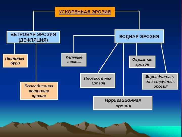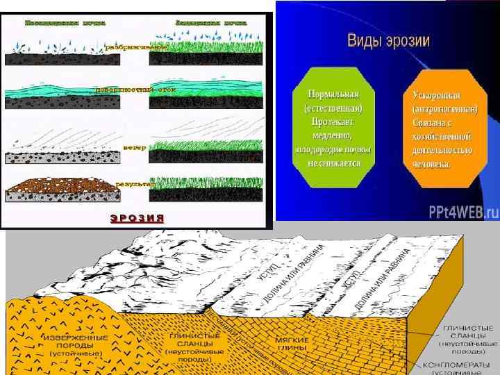 Эрозиялық құбылыстың дамуына сол жердің топырақ-өсімдік жамылғысы және геол. құрылысы да әсер етеді. Эрозия – жер бедерін қалыптастырушы факторлардың бірі. Түзілген жербедер пішіндеріне байланысты беткі Эрозияға (ағын өткен жер беті ой-шұңқырлары тегістеледі) және тілімдеу Эрозиясына (жер беті сай-жыраларға тілімделеді) ажыратылады. Беткі Эрозияаңғар және арнаның бүйірлері бұзылып, ағынның жайылуынан, ал тілімдеу Эрозиясы ағын арнасының тереңдеуінен қалыптасады. Демек, Эрозиялық бедер пішіндері – бүйірлік және тереңдік Эрозиялардың нәтижелері. Кейбір ғыл. әдебиетте “Эрозия” термині негізінен мұздық, жел және теңіз толқыны әрекетін сипаттағанда жиі қолданылады. Эрозияқұбылысына қарсы күресу жолдары – табиғатты қорғаудың басты шараларының бірі болып табылады. Сонымен қатар Эрозияның қалыпты (табиғи) және жеделдетілген (табиғи ортаны дұрыс пайдаланбау салдарынан) түрлері болады; қ. Топырақ эрозиясы. Ә. Байбатша