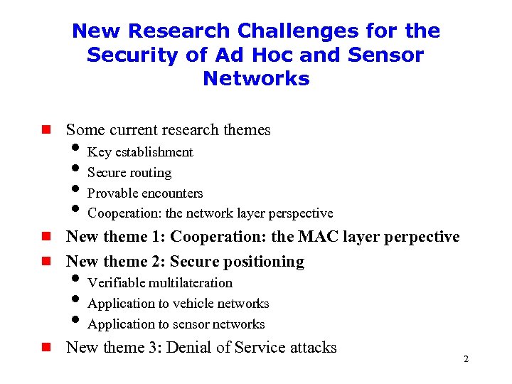 New Research Challenges for the Security of Ad Hoc and Sensor Networks g Some current research themes g g New theme 1: Cooperation: the MAC layer perpective New theme 2: Secure positioning g New theme 3: Denial of Service attacks i Key establishment i Secure routing i Provable encounters i Cooperation: the network layer perspective i Verifiable multilateration i Application to vehicle networks i Application to sensor networks 2