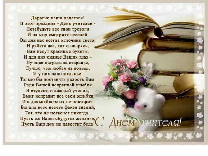 В день осенний, когда у порога Задышали уже холода, Школа празднует День педагога Праздник мудрости, знаний, труда. День учителя! Вслушайтесь сердцем В эти звуки, что дороги нам. Всем, что связано с юностью, с детством, Мы обязаны учителям.