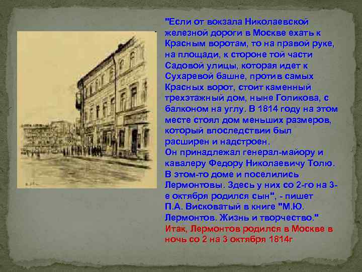 "Если от вокзала Николаевской железной дороги в Москве ехать к Красным воротам, то на правой руке, на площади, к стороне той части Садовой улицы, которая идет к Сухаревой башне, против самых Красных ворот, стоит каменный трехэтажный дом, ныне Голикова, с балконом на углу. В 1814 году на этом месте стоял дом меньших размеров, который впоследствии был расширен и надстроен. Он принадлежал генерал-майору и кавалеру Федору Николаевичу Толю. В этом-то доме и поселились Лермонтовы. Здесь у них со 2 -го на 3 е октября родился сын", - пишет П. А. Висковатый в книге "М. Ю. Лермонтов. Жизнь и творчество. " Итак, Лермонтов родился в Москве в ночь со 2 на 3 октября 1814 г