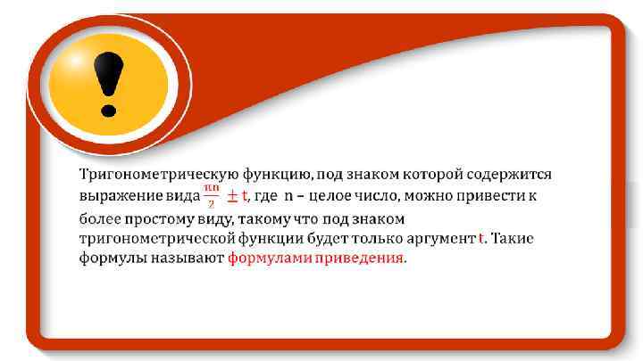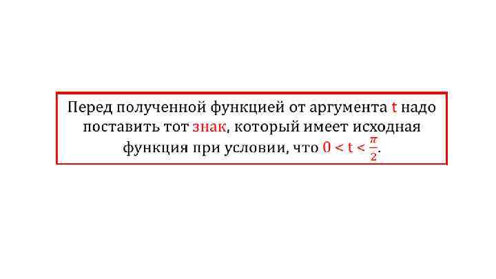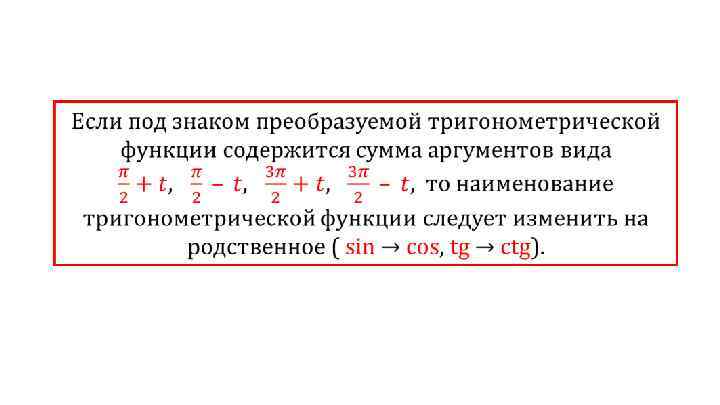 Если под знаком преобразуемой тригонометрической функции содержится сумма аргументов вида π + t, π – t, 2π + t, 2π – t, то наименование тригонометрической функции следует сохранить.