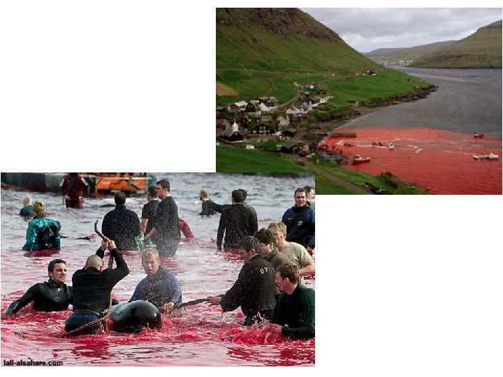 Море красного цвета А из-за человеческой жестокости (цивилизованных людей), убивающих сотни известных своим интеллектом Калдеронских дельфинов. это происходит каждый год на Фарерских островах в Дании. Главные участникик этого жестокого побоища — молодые подростки. ПОЧЕМУ? Этим они хотят доказать, что они взрослые и «крутые» ! В этом большом «празднике» все делается для развлечения. Каждый по-своему принимает в этом участие: убивая, или просто наблюдая за жестоким побоищем и поддерживая его Нужно сказать, что Калдеронские дельфины (Гринды), как и многие другие разновидности дельфинов, обладают хорошо развитыми инстинктами, не боятся подпускать к себе людей, играть и взаимодействовать с ними. . В ходе этого жестокого кровавого побоища несчастные животные не умирают немедленно, в них вонзают 1, 2, или 3 раза толстые острые крюки. При этом дельфины испускают душераздирающий крик, невероятно схожий с плачем новорожденного ребенка!