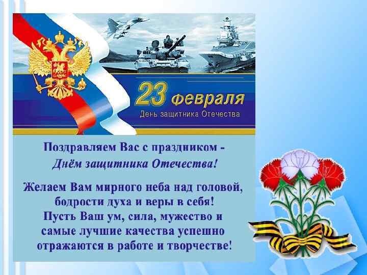 Если Вы считаете, что 23 февраля – это праздник военнослужащих, то Вы глубоко ошибаетесь! 23 февраля - это День Защитника Отечества. И каждый мужчина, будь он морским офицером или программистом, бизнесменом или милиционером, ученым или фермером - Защитник. 23 февраля – это День Защитника своего Отечества, своей семьи. 23 февраля – это День настоящего мужчины.