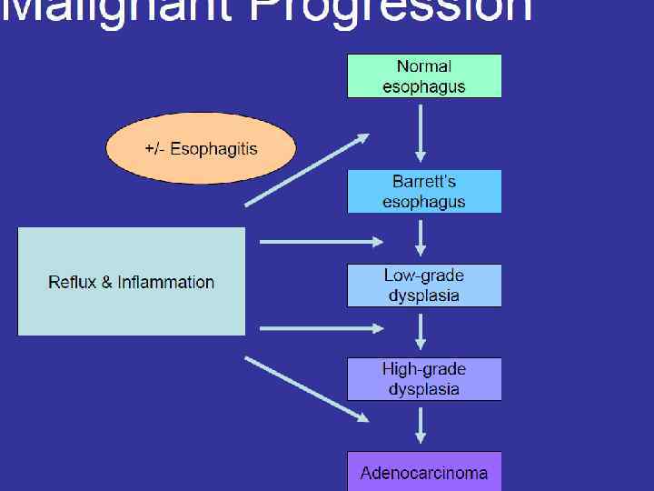 Adenocarcinoma: Barrett’s Esophagus Likely related to chronic GERD, obesity. Pathway of malignant progression. 40 to 125 times relative risk of adenocarcinoma. Incidence of cancer is approximately 0. 5% per year in patients with BE. No known effective screening tool. Usually Lower esophagus/GE junction.