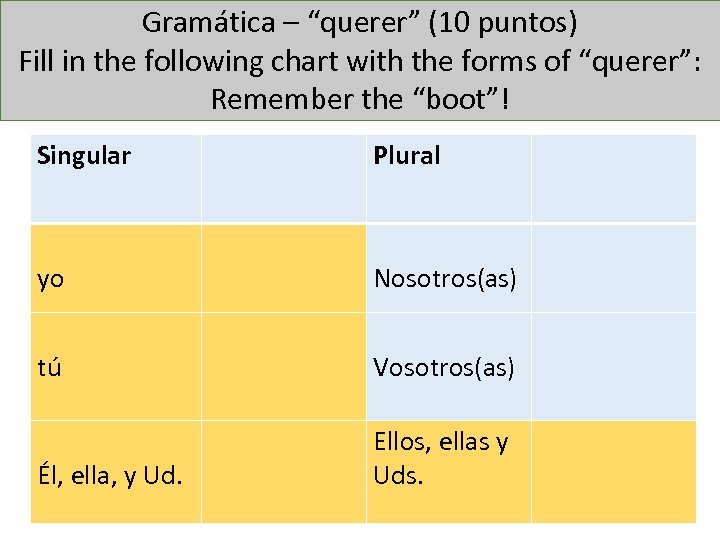 Gramática – “querer” (10 puntos) Fill in the following chart with the forms of “querer”: Remember the “boot”! Singular Plural yo Nosotros(as) tú Vosotros(as) Él, ella, y Ud. Ellos, ellas y Uds.