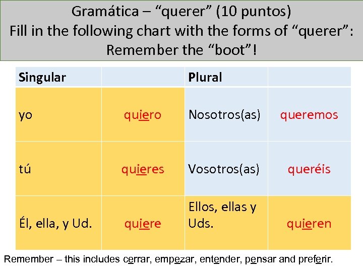Gramática – “querer” (10 puntos) Fill in the following chart with the forms of “querer”: Remember the “boot”! Singular Plural yo quiero Nosotros(as) queremos tú quieres Vosotros(as) queréis quiere Ellos, ellas y Uds. quieren Él, ella, y Ud. Remember – this includes cerrar, empezar, entender, pensar and preferir.