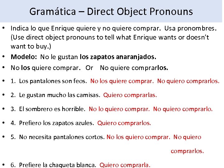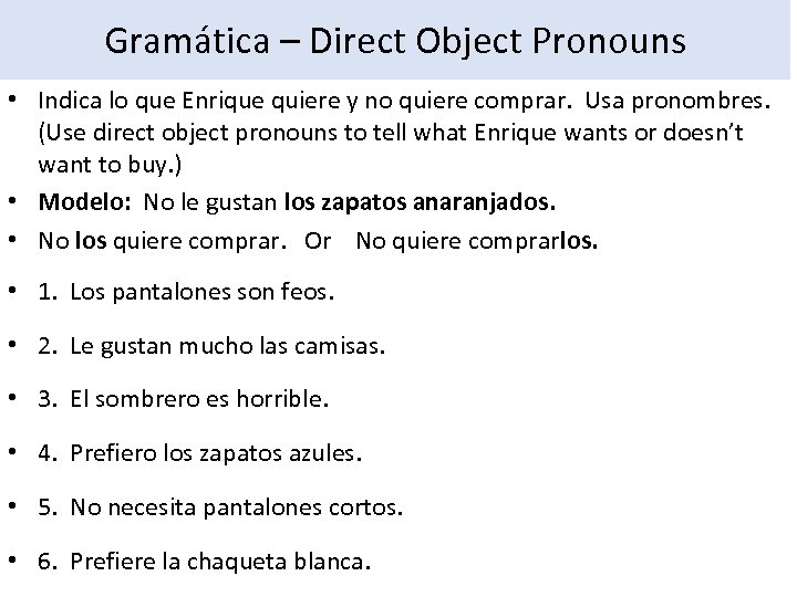 Gramática – Direct Object Pronouns • Indica lo que Enrique quiere y no quiere comprar. Usa pronombres. (Use direct object pronouns to tell what Enrique wants or doesn’t want to buy. ) • Modelo: No le gustan los zapatos anaranjados. • No los quiere comprar. Or No quiere comprarlos. • 1. Los pantalones son feos. • 2. Le gustan mucho las camisas. • 3. El sombrero es horrible. • 4. Prefiero los zapatos azules. • 5. No necesita pantalones cortos. • 6. Prefiere la chaqueta blanca.