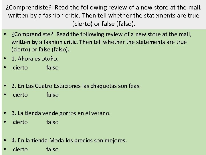 ¿Comprendiste? Read the following review of a new store at the mall, written by a fashion critic. Then tell whether the statements are true (cierto) or false (falso). • 1. Ahora es otoño. • cierto falso • 2. En Las Cuatro Estaciones las chaquetas son feas. • cierto falso • 3. La tienda vende gorros en el verano. • cierto falso • 4. En la tienda Moda los precios son mejores. • cierto falso