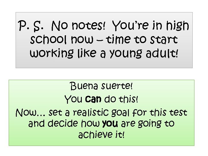 P. S. No notes! You’re in high school now – time to start working like a young adult! Buena suerte! You can do this! Now… set a realistic goal for this test and decide how you are going to achieve it!