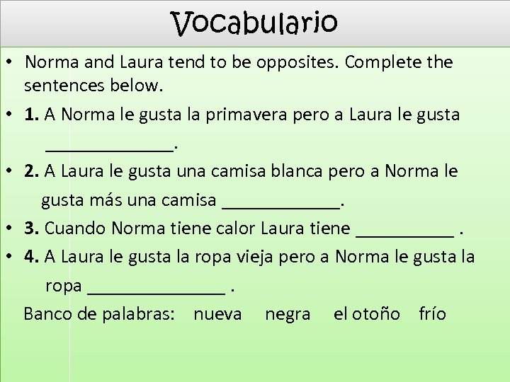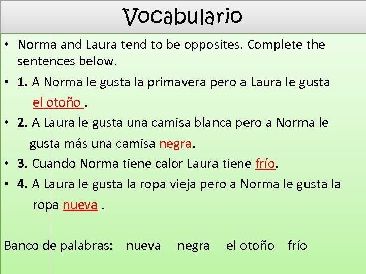 Vocabulario • Norma and Laura tend to be opposites. Complete the sentences below. • 1. A Norma le gusta la primavera pero a Laura le gusta el otoño. • 2. A Laura le gusta una camisa blanca pero a Norma le gusta más una camisa negra. • 3. Cuando Norma tiene calor Laura tiene frío. • 4. A Laura le gusta la ropa vieja pero a Norma le gusta la ropa nueva. Banco de palabras: nueva negra el otoño frío