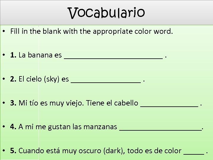 Vocabulario • Fill in the blank with the appropriate color word. • 1. La banana es ____________. • 2. El cielo (sky) es _________. • 3. Mi tío es muy viejo. Tiene el cabello _______. • 4. A mi me gustan las manzanas __________. • 5. Cuando está muy oscuro (dark), todo es de color _____.