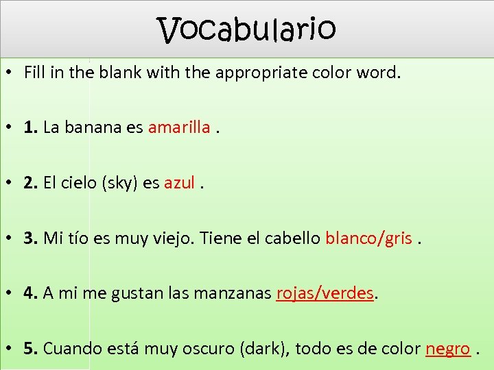 Vocabulario • Fill in the blank with the appropriate color word. • 1. La banana es amarilla. • 2. El cielo (sky) es azul. • 3. Mi tío es muy viejo. Tiene el cabello blanco/gris. • 4. A mi me gustan las manzanas rojas/verdes. • 5. Cuando está muy oscuro (dark), todo es de color negro.