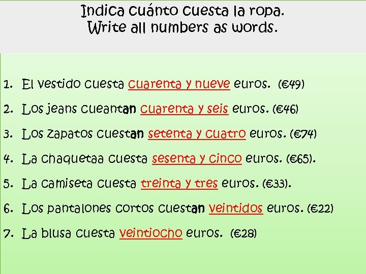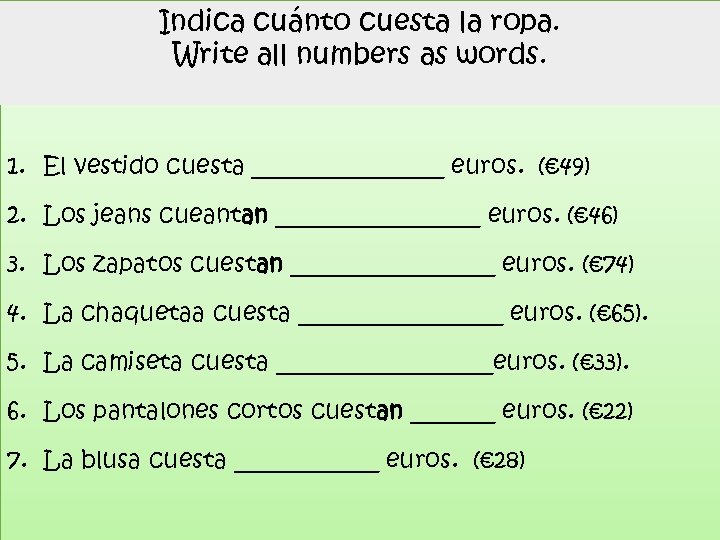 Indica cuánto cuesta la ropa. Write all numbers as words. 1. El vestido cuesta ________ euros. (€ 49) 2. Los jeans cueantan _________ euros. (€ 46) 3. Los zapatos cuestan _________ euros. (€ 74) 4. La chaquetaa cuesta _________ euros. (€ 65). 5. La camiseta cuesta _________euros. (€ 33). 6. Los pantalones cortos cuestan _______ euros. (€ 22) 7. La blusa cuesta ______ euros. (€ 28)