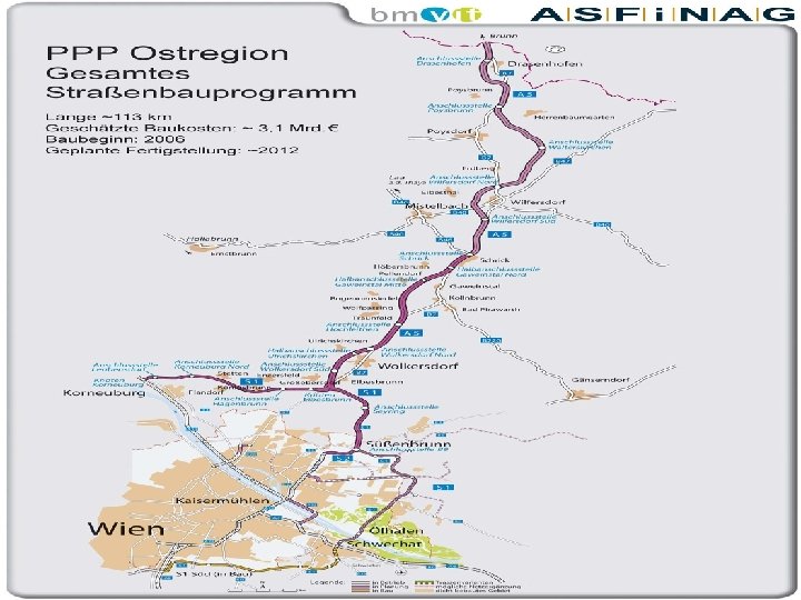 PPP-Projekt Ostregion Tratte Lunghezza Valore (€M) Bando Ypsilon A 5 SUD S 1 EST S 1 OVEST S 2 51 KM 850 MAGGIO 2005 A 5 NORD A A 5 NORD B 34 KM 22 KM 260 105 2006 OLHAFEN S 1 LOBAU S 1 DANUBIO 20 KM 1370 2007 A 22 7 KM 610 2007 134 KM 3, 2 bn TOTALE