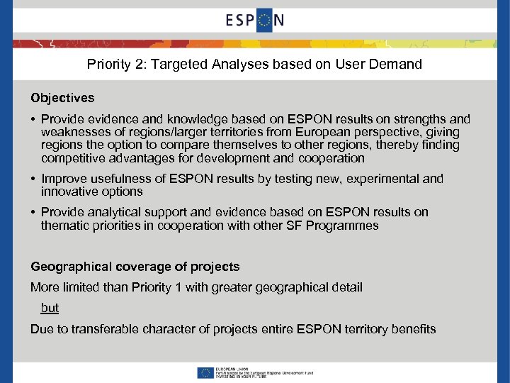 Priority 2: Targeted Analyses based on User Demand Objectives • Provide evidence and knowledge based on ESPON results on strengths and weaknesses of regions/larger territories from European perspective, giving regions the option to compare themselves to other regions, thereby finding competitive advantages for development and cooperation • Improve usefulness of ESPON results by testing new, experimental and innovative options • Provide analytical support and evidence based on ESPON results on thematic priorities in cooperation with other SF Programmes Geographical coverage of projects More limited than Priority 1 with greater geographical detail but Due to transferable character of projects entire ESPON territory benefits