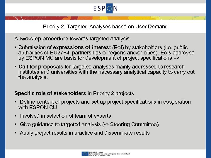 Priority 2: Targeted Analyses based on User Demand A two-step procedure towards targeted analysis • Submission of expressions of interest (Eo. I) by stakeholders (i. e. public authorities of EU 27+4, partnerships of regions and/or cities). Eo. Is approved by ESPON MC are basis for development of project specifications => • Call for proposals for targeted analyses mainly addressed to research institutes and universities with the necessary analytical capacity to carry out the analysis. Specific role of stakeholders in Priority 2 projects • Define content of projects and set up project specifications in cooperation with ESPON CU • Involved in selection of team of experts • Give guidance to targeted analysis (-> Steering Committee) • Apply project results in practice and disseminate results