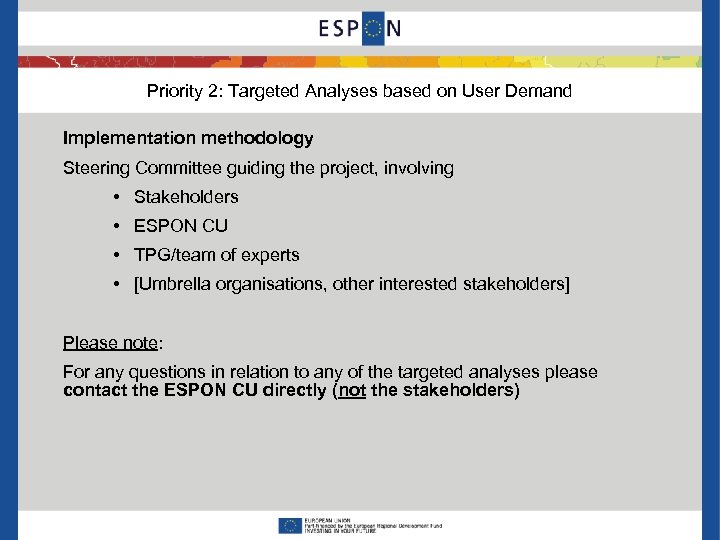 Priority 2: Targeted Analyses based on User Demand Implementation methodology Steering Committee guiding the project, involving • Stakeholders • ESPON CU • TPG/team of experts • [Umbrella organisations, other interested stakeholders] Please note: For any questions in relation to any of the targeted analyses please contact the ESPON CU directly (not the stakeholders)