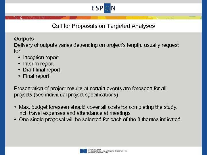 Call for Proposals on Targeted Analyses Outputs Delivery of outputs varies depending on project’s length, usually request for • Inception report • Interim report • Draft final report • Final report Presentation of project results at certain events are foreseen for all projects (see individual project specifications) • Max. budget foreseen should cover all costs for completing the study, incl. travel expenses and attendance at meetings • One single proposal will be selected for each of the 8 themes indicated