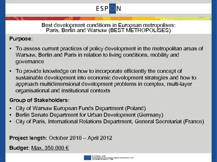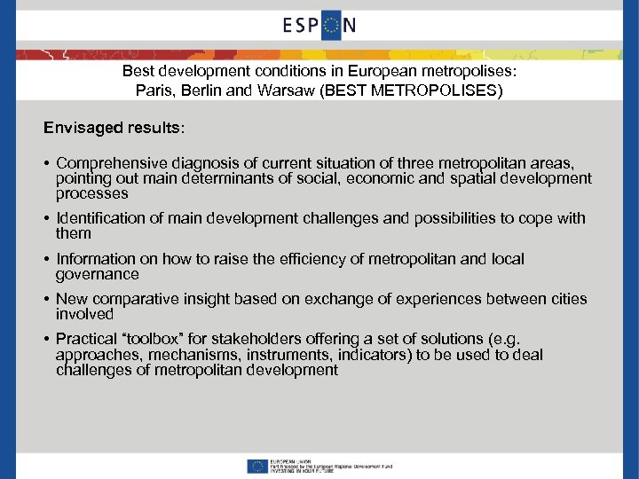 Best development conditions in European metropolises: Paris, Berlin and Warsaw (BEST METROPOLISES) Envisaged results: • Comprehensive diagnosis of current situation of three metropolitan areas, pointing out main determinants of social, economic and spatial development processes • Identification of main development challenges and possibilities to cope with them • Information on how to raise the efficiency of metropolitan and local governance • New comparative insight based on exchange of experiences between cities involved • Practical “toolbox” for stakeholders offering a set of solutions (e. g. approaches, mechanisms, instruments, indicators) to be used to deal challenges of metropolitan development