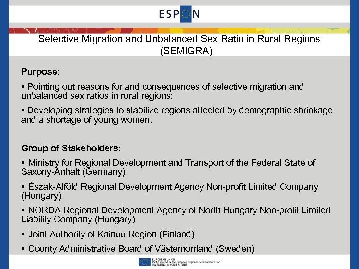 Selective Migration and Unbalanced Sex Ratio in Rural Regions (SEMIGRA) Purpose: • Pointing out reasons for and consequences of selective migration and unbalanced sex ratios in rural regions; • Developing strategies to stabilize regions affected by demographic shrinkage and a shortage of young women. Group of Stakeholders: • Ministry for Regional Development and Transport of the Federal State of Saxony-Anhalt (Germany) • Észak-Alföld Regional Development Agency Non-profit Limited Company (Hungary) • NORDA Regional Development Agency of North Hungary Non-profit Limited Liability Company (Hungary) • Joint Authority of Kainuu Region (Finland) • County Administrative Board of Västernorrland (Sweden)