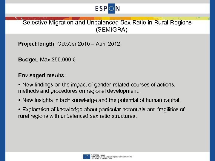 Selective Migration and Unbalanced Sex Ratio in Rural Regions (SEMIGRA) Project length: October 2010 – April 2012 Budget: Max 350. 000 € Envisaged results: • New findings on the impact of gender-related courses of actions, methods and procedures on regional development. • New insights in tacit knowledge and the potential of human capital. • Exploration of knowledge about particular potentials and fragilities of rural regions with unbalanced sex ratio structures.
