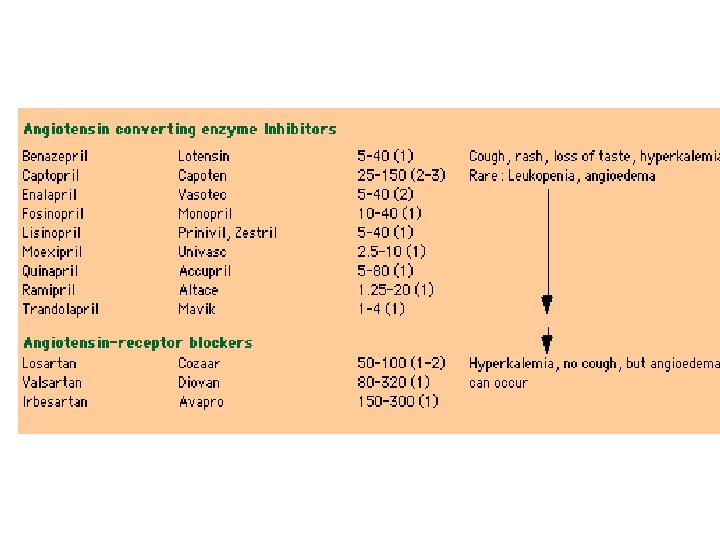 Антигипертензионные лекарственные средства Лекарство доза, мгсутки побочные эффекты --------------------------------------Гипотиазид 12, 5 -50 Хлорталидон 12, 5 - 50 Металозон 0, 5 – 1, 0 Индапамид 2, 5 Фуросемид 40 - 240 Тораземид 5 -40 Спиронолактоны 25 -100 Амилорид 5 -10 К, холестерин, глюкоза фото сенсибилизация, панкреатит короткое действие длительное действие гиперкалиемия, гинекомастия гиперкалиемия