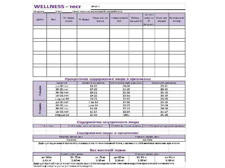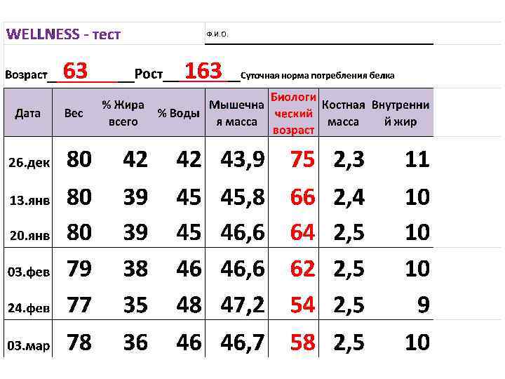 WELLNESS - тест Возраст 52 Дата Ф. И. О. Рост Вес 151 Суточная норма потребления белка % Жира всего % Воды Мышечная масса Биологический Костная масса возраст Внутренний жир 16. янв 80, 09 49, 8 42, 6 44, 4 71 2, 4 12 13. янв 80, 1 39, 9 44 45, 4 68 2, 4 11 27. янв 80, 9 39, 9 44, 4 46, 2 67 2, 5 11 03. фев 80, 9 38, 3 45, 5 47, 4 62 2, 5 11 24. фев 81 38, 4 45, 5 47, 2 62 2, 5 11 14. апр 80, 1 38, 3 45, 5 47, 7 62 2, 5 11