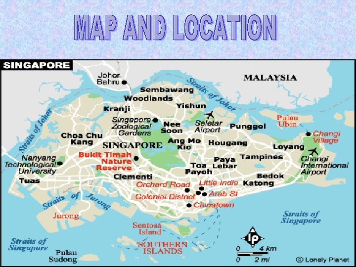 • Our Geography Singapore is located at one of the major crossroads of the world, the South China Sea, a mere 136 km north of the Equator and on the Southern tip of the Malay Peninsular. Singapore is not just one island but a main island with over 60 surrounding islets. The main island has a total land area of about 640 square km.
