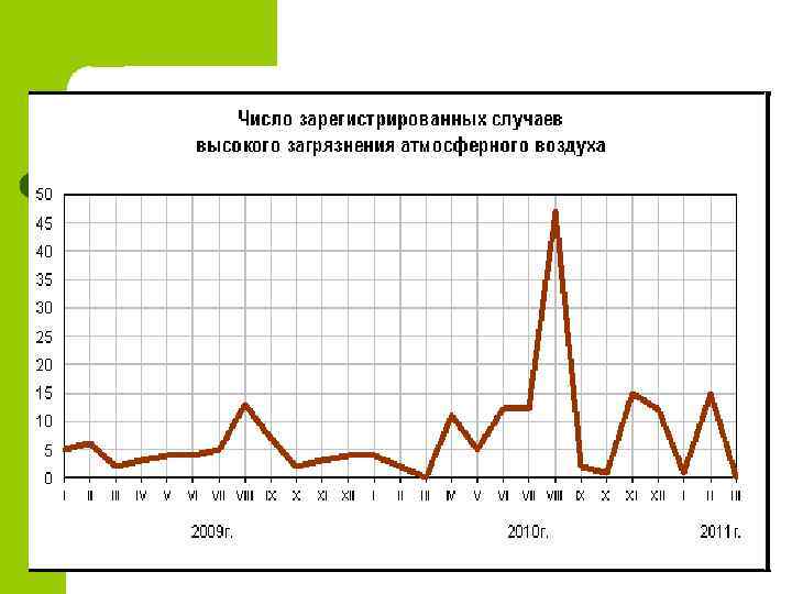Загрязнение атмосферы В I квартале 2011 г. службами мониторинга природной среды Росгидромета было зафиксировано 17 случаев экстремально высокого и высокого загрязнения атмосферного воздуха (10 ПДК и более). Кроме того, зафиксирован 1 случай аварийного загрязнения (в I квартале 2010 г. - 4 случая).