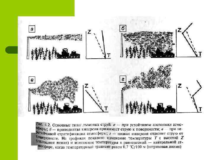 Рациональное размещение предприятий l l l l Рациональное размещение предприятий основывается на расчетах распространения примесей в атмосфере. Покинув источник, струя примеси движется по ветру и одновременно благодаря диффузии расширяется. Особую роль играют температурные инверсии. Если слой теплого воздуха располагается над слоем холодного и граница между слоями находится выше источника, то такая приподнятая инверсия запирает примесь у поверхности земли. При слабом ветре это приводит к скоплению загрязняющих примесей у поверхности вблизи источника — наихудшая ситуация с точки зрения загрязнения воздуха. Когда источник — труба расположен выше инверсионного слоя, то примесь распространяется вверх. Это одна из главных причин строительства высотных труб. Если источник приподнят над поверхностью, то примеси требуется некоторое время, чтобы достичь поверхности. Поэтому максимум приземной концентрации примеси возникает не непосредственно «под трубой» , а на некотором расстоянии. При удалении от источника примесь рассеивается как по вертикали, так и в горизонтальном направлении, поэтому максимум приземной концентрации уменьшается. Это вторая причина строительства высотных труб.