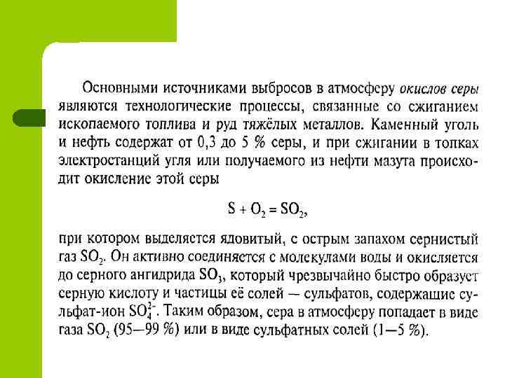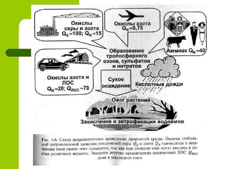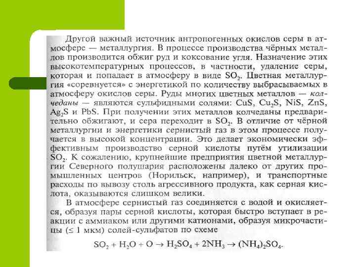 Кислотное загрязнение l l l Множество технологических процессов, особенно связанных с получением энергии, основано на окислении углеводородов. Если бы топливо состояло только из углеводородов, а воздух — из кислорода, то при полном сгорании в атмосферу попадали бы только углекислый газ и пары воды. Однако в топливе всегда есть примеси, а в воздухе — азот, да и само сгорание не всегда оказывается полным. В результате в атмосфере оказывается целый набор загрязняющих веществ, основную массу которых составляют окислы серы и азота, способные образовывать сильные кислоты. Этих вещества в природной среде интенсивно взаимодействуют с аммиаком, поэтому аммиак как загрязнитель всегда рассматривается в рамках проблемы кислотного загрязнения.