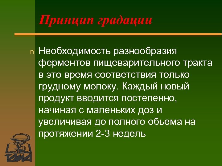 Принцип градации n Необходимость разнообразия ферментов пищеварительного тракта в это время соответствия только грудному молоку. Каждый новый продукт вводится постепенно, начиная с маленьких доз и увеличивая до полного обьема на протяжении 2 -3 недель