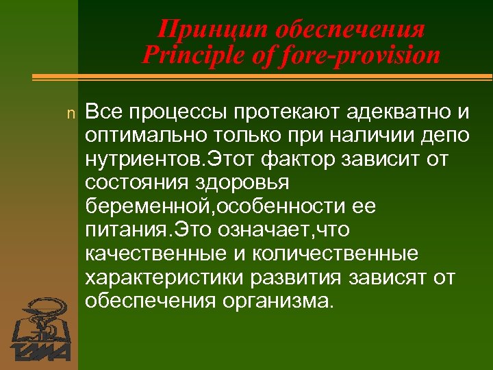 Принцип обеспечения Principle of fore-provision n Все процессы протекают адекватно и оптимально только при наличии депо нутриентов. Этот фактор зависит от состояния здоровья беременной, особенности ее питания. Это означает, что качественные и количественные характеристики развития зависят от обеспечения организма.