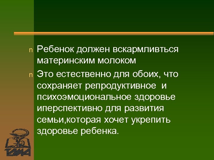n n Ребенок должен вскармливться материнским молоком Это естественно для обоих, что сохраняет репродуктивное и психоэмоциональное здоровье иперспективно для развития семьи, которая хочет укрепить здоровье ребенка.