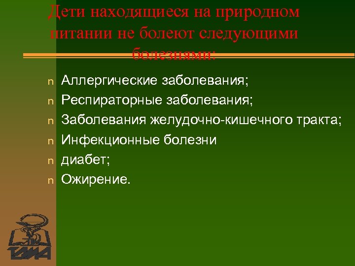 Дети находящиеся на природном питании не болеют следующими болезнями: n n n Аллергические заболевания; Респираторные заболевания; Заболевания желудочно-кишечного тракта; Инфекционные болезни диабет; Oжирение.