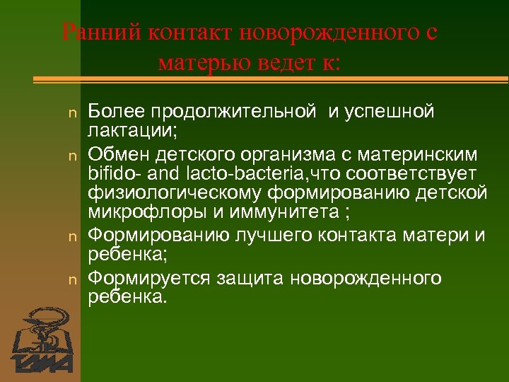 Ранний контакт новорожденного с матерью ведет к: n n Более продолжительной и успешной лактации; Обмен детского организма с материнским bifido- and lacto-bacteria, что соответствует физиологическому формированию детской микрофлоры и иммунитета ; Формированию лучшего контакта матери и ребенка; Формируется защита новорожденного ребенка.