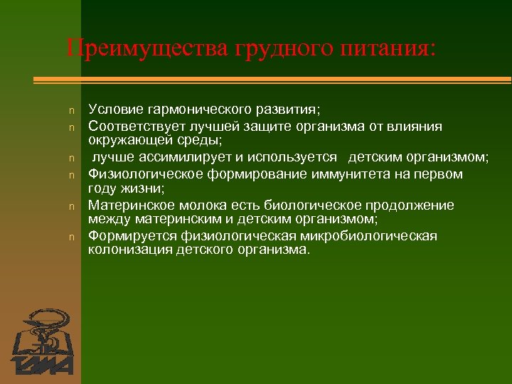 Преимущества грудного питания: n n n Условие гармонического развития; Соответствует лучшей защите организма от влияния окружающей среды; лучше ассимилирует и используется детским организмом; Физиологическое формирование иммунитета на первом году жизни; Материнское молока есть биологическое продолжение между материнским и детским организмом; Формируется физиологическая микробиологическая колонизация детского организма.