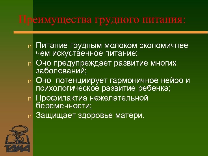 Преимущества грудного питания: n n n Питание грудным молоком экономичнее чем искуственное питание; Оно предупреждает развитие многих заболеваний; Оно потенциирует гармоничное нейро и психологическое развитие ребенка; Профилактиа нежелательной беременности; Защищает здоровье матери.