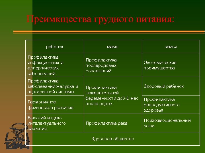 Преимкщества грудного питания: ребенок мама семья Профилактика инфекционных и аллергических заболеваний Профилактика послеродовых осложнений Экономические преимущества Профилактика заболеваний желудка и эндокринной системы Гармоничное физическое развитие Высокий индекс интелектуального развития Здоровый ребенок Профилактика нежелательной беременности до 3 -6 мес Профилактика после родов репродуктивного здоровья Профилактика рака Здоровое общество Психоэмоциональный союз
