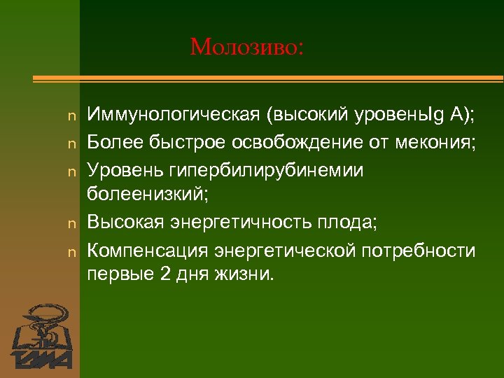 Молозиво: n n n Иммунологическая (высокий уровень. Ig A); Более быстрое освобождение от мекония; Уровень гипербилирубинемии болеенизкий; Высокая энергетичность плода; Компенсация энергетической потребности первые 2 дня жизни.