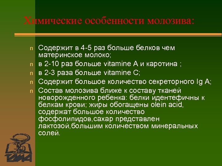 Химические особенности молозива: n n n Содержит в 4 -5 раз больше белков чем материнское молоко; в 2 -10 раз больше vitamine A и каротина ; в 2 -3 раза больше vitamine C; Содержит большое количество секреторного Ig A; Состав молозива ближе к составу тканей новорожденного ребенка: белки идентефичны к белкам крови; жиры обогащены olein acid, содержат большое количество фосфолипидов, сахар представлен лактозой, большим количеством минеральных солей.