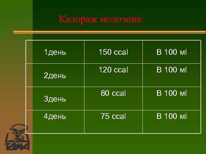 Калораж молозива: 1 день 2 день 3 день 4 день 150 ccаl В 100 мl 120 ccаl В 100 мl 80 ccаl В 100 мl 75 ccаl В 100 мl