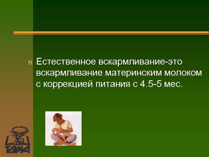 n Естественное вскармливание-это вскармливание материнским молоком с коррекцией питания с 4. 5 -5 мес.