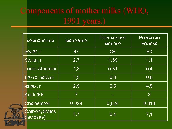 Components of mother milks (WHО, 1991 years. ) молозиво Переходное молоко Развитое молоко водаr, г 87 88 88 белки, г 2, 7 1, 59 1, 1 Lacto-Albumini 1, 2 0, 51 0, 4 Лактоглобулі 1, 5 0, 8 0, 6 жиры, г 2, 9 3, 5 4, 5 Acidi ЖК 7 - 8 0, 024 0, 014 5, 7 6, 4 7, 1 компоненты Cholesteroli Carbohydrates (lactosae)