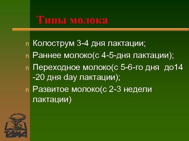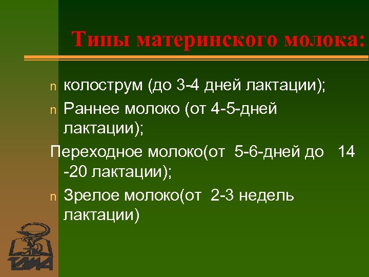 Типы материнского молока: колострум (до 3 -4 дней лактации); n Раннее молоко (от 4 -5 -дней лактации); Переходное молоко(от 5 -6 -дней до 14 -20 лактации); n Зрелое молоко(от 2 -3 недель лактации) n