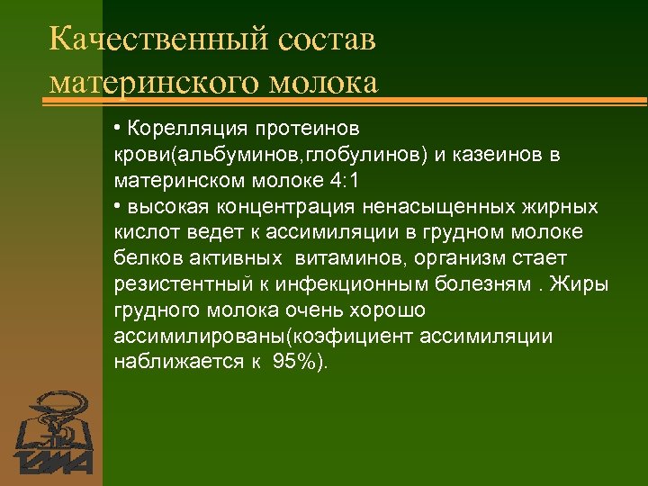 Качественный состав материнского молока • Корелляция протеинов крови(альбуминов, глобулинов) и казеинов в материнском молоке 4: 1 • высокая концентрация ненасыщенных жирных кислот ведет к ассимиляции в грудном молоке белков активных витаминов, организм стает резистентный к инфекционным болезням. Жиры грудного молока очень хорошо ассимилированы(коэфициент ассимиляции наближается к 95%).