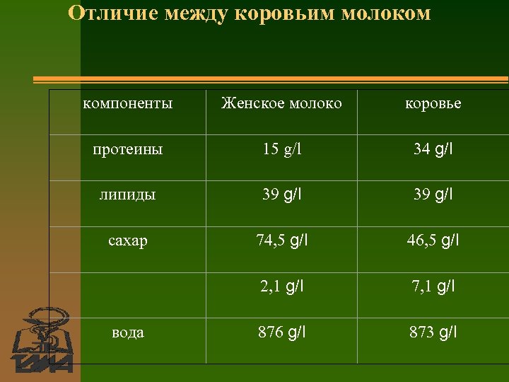 Отличие между коровьим молоком компоненты Женское молоко коровье протеины 15 g/l 34 g/l липиды 39 g/l сахар 74, 5 g/l 46, 5 g/l 2, 1 g/l 7, 1 g/l 876 g/l 873 g/l вода