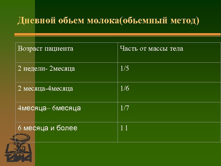 Дневной обьем молока(обьемный метод) Возраст пациента Часть от массы тела 2 недели- 2 месяца 1/5 2 месяца-4 месяца 1/6 4 месяца– 6 месяца 1/7 6 месяца и более 1 l